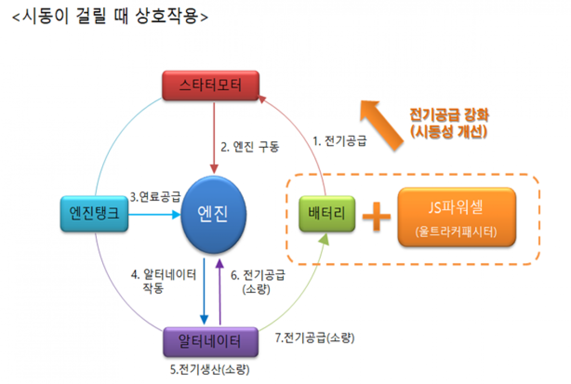 기존에 활용되던 커패시터의 쓰임새를 응용해서 자동차에 접목시킨게 js파워셀이라는 제품입니다!