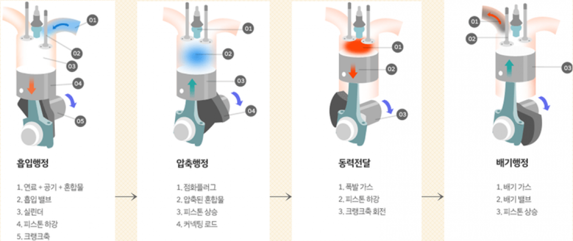 연료실에 연료 주입 -> 점화 -> 폭발로 생긴 압축의 힘으로 피스톤을 아래로 밀며 왕복운동을 시켜 에너지를 만들고 그 에너지를 크랭크 축에 전달하면 차를 움직일수 있게 하는 회전의 힘이 생기는 것입니다